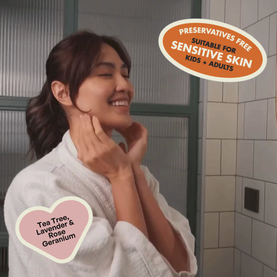 A calming blend of 100% Pure Tea Tree, Lavender and Rose Geranium Essential Oil